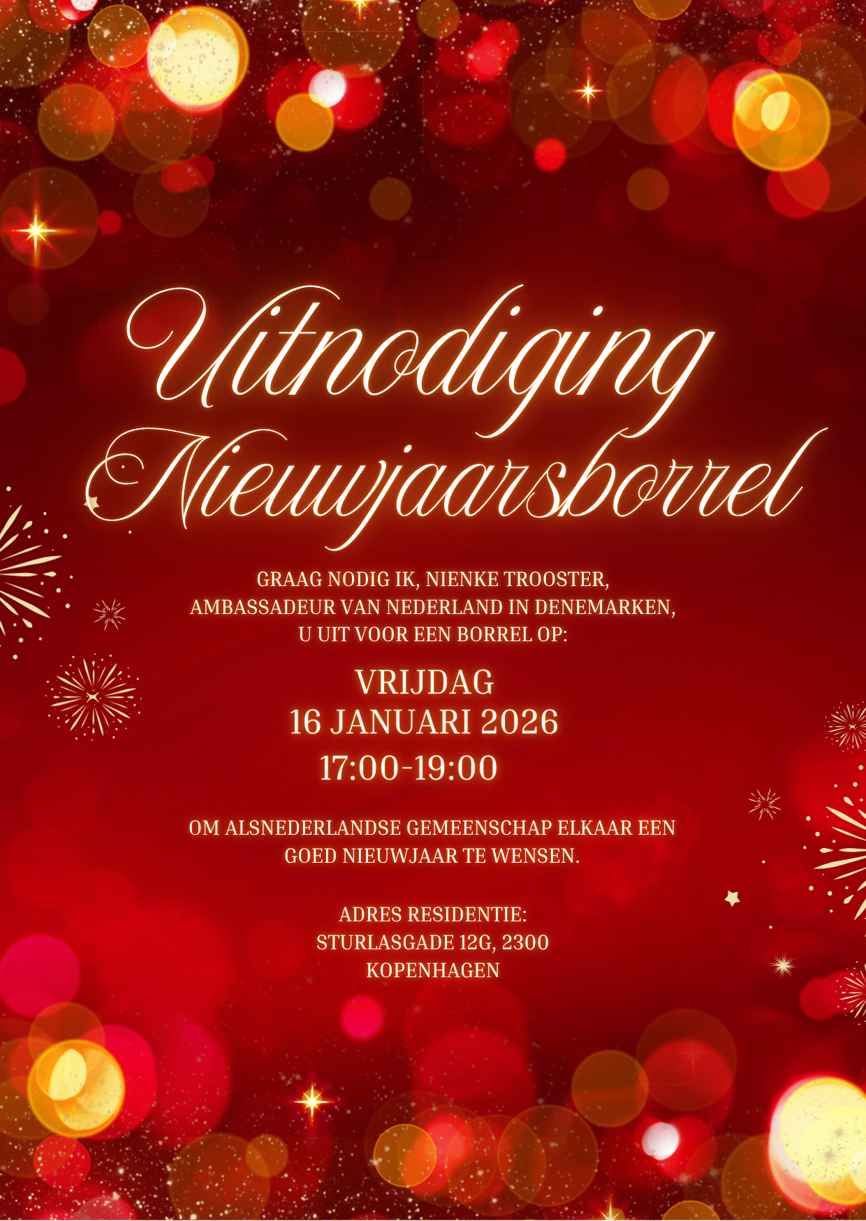 De Nederlandse ambassadeur in Denemarken, Nienke Trooster, nodigt leden van de vereniging uit voor een nieuwjaarsborrel op vrijdag 16 januari 2026 van 17:00 uur to 19:00 uur; zie de uitnodiging hieronder.